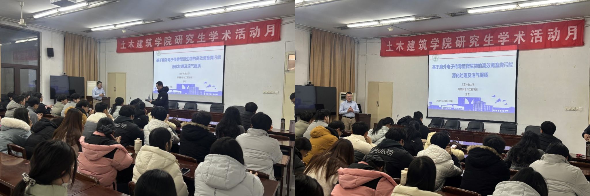 12月23日上午,学院特邀北京林业大学环境科学与工程学院党岩教授,在第8教学楼223报告厅作了题为《基于胞外电子传导型微生物的高效禽畜粪污能源化处理及沼气提质》的学术报告。报告会由学院副院长王嘉斌主持,学院40余位专业教师及研究生参加了此次学术交流活动。